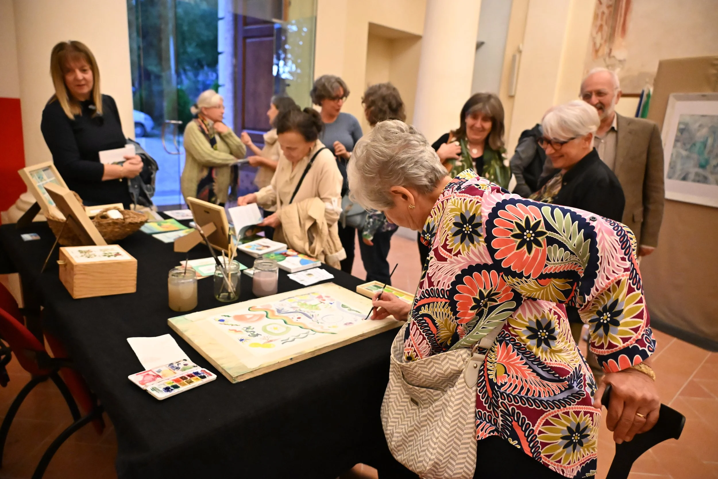 Una mostra in cui non solo si guardano le opere, ma chi vuole può anche cimentarsi con carta e acquerelli, giocando (al posto del libro delle firme c’era un grande foglio, pennelli e acquerelli per tutti) oppure partecipando ad due workshops il cui ricavato è andato completamente a supportare una cartiera sostenuta dall’Operazione Mato Grosso (che produce una carta da acquerello fantastica) in Perù.
